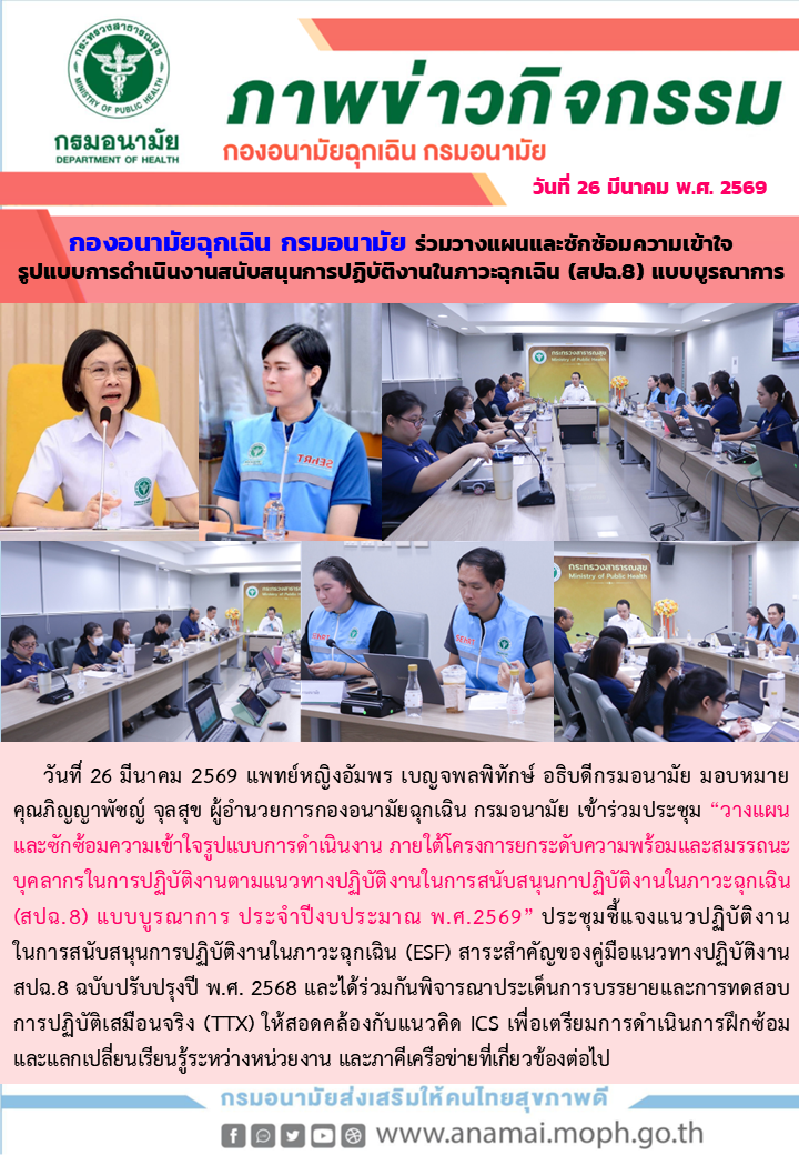 องอนามัยฉุกเฉิน กรมอนามัย ร่วมวางแผนและซักซ้อมความเข้าใจรูปแบบการดำเนินงานสนับสนุนการปฏิบัติงานในภาวะฉุกเฉิน (สปฉ.8) แบบบูรณาการ